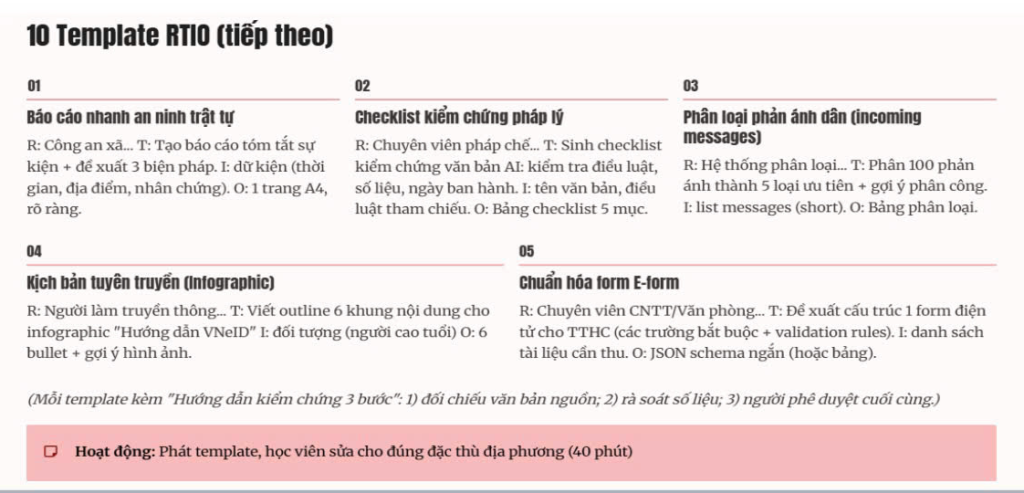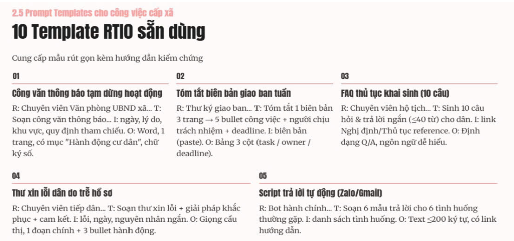 Day 14 Thiện xin gửi templete 10 câu prompt theo chuẩn RTIO (Role Vai trò, Task Nhiệm vụ, Input Vào và Output Ra nhé). Với tinh thần AI First nhằm giảm tải công việc.