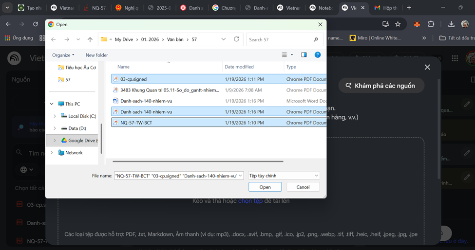 Lấy ví dụ về Nghị quyết 57 của BCT và nghị định 03 cũng như 140 nhiệm vụ triển khai nghị quyết và nghị định load lên để chúng ta cùng trao đổi với AI